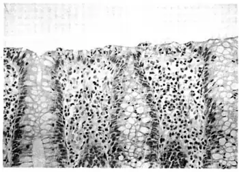 - ↑ Lazenby AJ, Yardley JH, Giardiello FM, Jessurun J, Bayless TM (1989). "Lymphocytic ("microscopic") colitis: a comparative histopathologic study with particular reference to collagenous colitis". Hum. Pathol. 20 (1): 18–28. doi:10.1016/0046-8177(89)90198-6. PMID 2912870.
