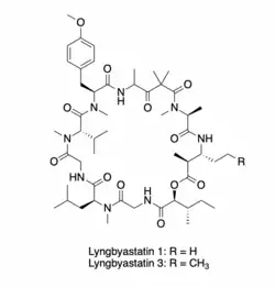 - ↑ Williams, Philip G.; Moore, Richard E.; Paul, Valerie J. (2003-10-01). "Isolation and Structure Determination of Lyngbyastatin 3, a Lyngbyastatin 1 Homologue from the Marine Cyanobacterium Lyngbya m ajuscula. Determination of the Configuration of the 4-Amino-2,2-dimethyl-3-oxopentanoic Acid Unit in Majusculamide C, Dolastatin 12, Lyngbyastatin 1, and Lyngbyastatin 3 from Cyanobacteria". Journal of Natural Products. 66 (10): 1356–1363. Bibcode:2003JNAtP..66.1356W. doi:10.1021/np0302145. ISSN 0163-3864. PMID 14575437.