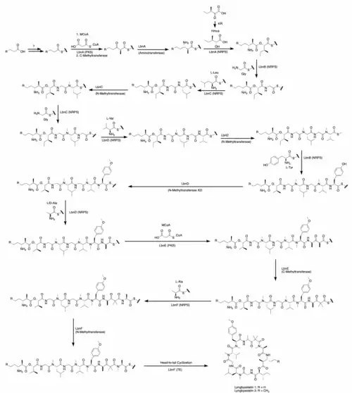 NRPS LbnD then adds L-valine, L-tyrosine, and L or D-valine, respectively to the growing molecule. PKS LbnE couples an acyl unit from malonyl-CoA onto the C-terminus of the valine residue before a C-methyltransferase methylates the carbon alpha to the thioester twice to produce a quaternary alpha carbon.