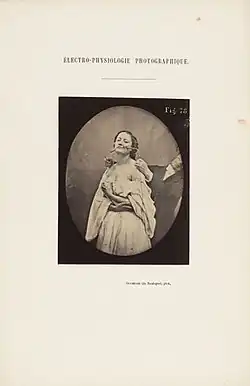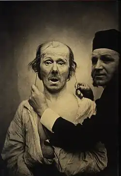 Duchenne was convinced that the "truth" of his pathognomic experiments could only be effectively rendered by photography, the subject's expressions being too fleeting to be drawn or painted. "Only photography," he writes, "as truthful as a mirror, could attain such desirable perfection".[6] He worked with a talented, young photographer, Adrian Tournachon, (the brother of Felix Nadar), and also taught himself the art in order to document his experiments.[7] From an art-historical point of view, the Mechanism of Human Physiognomy was the first publication on the expression of human emotions to be illustrated with actual photographs. Photography had only been invented recently, and there was a widespread belief that this was a medium that could capture the "truth" of any situation in a way that other mediums were unable to do.