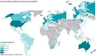 MDMA was first developed in 1912 by Merck.[25] It was used to enhance psychotherapy beginning in the 1970s and became popular as a street drug in the 1980s.[15][16] MDMA is commonly associated with dance parties, raves, and electronic dance music.[26] It may be mixed with other substances such as ephedrine, amphetamine, and methamphetamine.[15] In 2016, about 21 million people between the ages of 15 and 64 used ecstasy (0.3% of the world population).[27] This was broadly similar to the percentage of people who use cocaine or amphetamines, but lower than for cannabis or opioids.[27] In the United States, as of 2017, about 7% of people have used MDMA at some point in their lives and 0.9% have used it in the last year.[28]