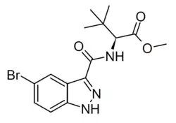 MDMB-5Br-INACA is an indazole-3-carboxamide derivative which has been sold as a designer drug.[2] Surprisingly it has been reported to produce psychoactive activity despite the lack of a "tail" group at the indazole 1-position, but is likely of relatively low potency as a CB1 agonist and has been encountered being misrepresented as other illicit drugs such as MDMA.[3][4] This reported psychoactive activity has been limitedly reported on but could be related to activity beyond the cannabinoid receptors due to vague structural relation to compounds like 1Z2MAP1O.