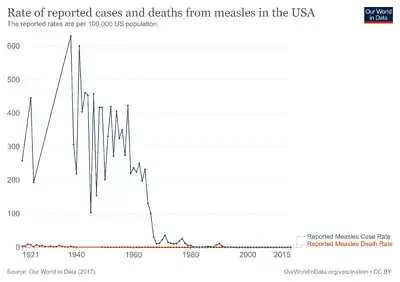 The MMRV vaccine is a vaccine against measles, mumps, rubella and chickenpox, which combines the MMR vaccine (MMR) with the varicella vaccine (V).[4] More than 95% effectiveness in preventing measles is achieved after the first dose, and 96% after the second dose.[5] When one child in a household is given the MMRV, some protection is achieved for others around them.[5] It appears to be more effective in preventing chicken pox than by giving the varicella vaccine on its own.[6] It is given as a 0.5 mL dose, by injection into muscle or under the skin to children between one and two years of age, but not after age 12 years.[7][8]