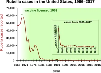 Before the widespread use of a vaccine against measles, rates of disease were so high that infection was felt to be "as inevitable as death and taxes."[22] Reported cases of measles in the United States fell from hundreds of thousands to tens of thousands per year following introduction of the vaccine in 1963. Increasing uptake of the vaccine following outbreaks in 1971, and 1977, brought this down to thousands of cases per year in the 1980s. An outbreak of almost 30,000 cases in 1990 led to a renewed push for vaccination and the addition of a second vaccine to the recommended schedule. Fewer than 200 cases have been reported in the U.S. each year between 1997 and 2013, and the disease is no longer considered endemic there.[23][24][25]