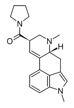MPD-75, also known as 1-methyl-N-pyrrolidyllysergamide or as 1-methyllysergic acid pyrrolidide, is a psychedelic drug of the lysergamide family related to lysergic acid diethylamide (LSD).[1][2][3][4] It is the 1-methyl derivative of lysergic acid pyrrolidide (LA-Pyr; LPD-824) and the N-pyrrolidide analogue of 1-methyl-LSD (MLD-41).[2] Extensive metabolism of other 1-methylated lysergamides to their secondary amine derivatives, for instance methysergide (1-methylmethylergometrine) conversion into methylergometrine, has been observed.[5][6]