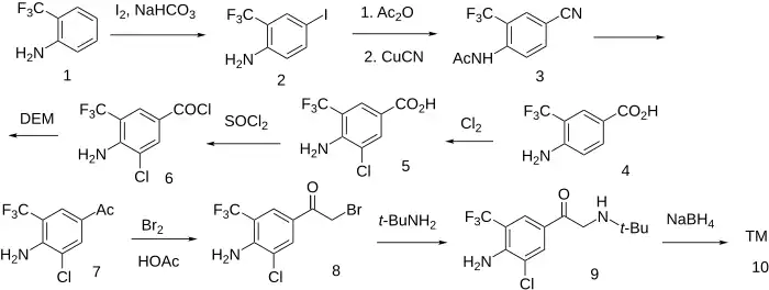 The halogenation of 2-(Trifluoromethyl)aniline [88-17-5] (1) with iodine and sodium bicarbonate resulted in 2-Amino-5-Iodobenzotrifluoride [97760-97-9] (2). Protection with acetic anhydride followed by nucleophilic aromatic displacement with copper(I)cyanide gave N-[4-cyano-2-(trifluoromethyl)phenyl]acetamide [175277-96-0] (3). Hydrolysis of the nitrile and the protecting group gave 4-amino-3-(trifluoromethyl)benzoic acid [400-76-0] (4). Halogenation with chlorine gave 4-Amino-3-Chloro-5-(Trifluoromethyl)Benzoic Acid [95656-52-3] (5). Halogenation of the acid with thionyl chloride gave 4-Amino-3-chloro-5-(trifluoromethyl)benzoylchloride [63498-15-7] (6). Treatment with diethyl malonate [105-53-3] gave the acetophenone and hence 1-[4-amino-3-chloro-5-(trifluoromethyl)phenyl]ethanone [97760-76-4] (7). Halogenation with bromine in acetic acid led to 1-[4-amino-3-chloro-5-(trifluoromethyl)phenyl]-2-bromoethanone [97760-87-7] (8). Treatment with tert-butylamine [75-64-9] yielded 1-[4-amino-3-chloro-5-(trifluoromethyl)phenyl]-2-(tert-butylamino)ethenone, CID:13355601 (9). Reduction of the ketone with sodium borohydride completed the synthesis of Mabuterol (10).