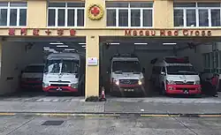 Macau Red Cross operates a fleet of ambulances (MB Sprinter vans, Toyota Coaster minibuses, Toyota Hiace van) to supplement the fire service's amubulance fleet.[8] Part of the fleet operates from Areia Preta Station.
