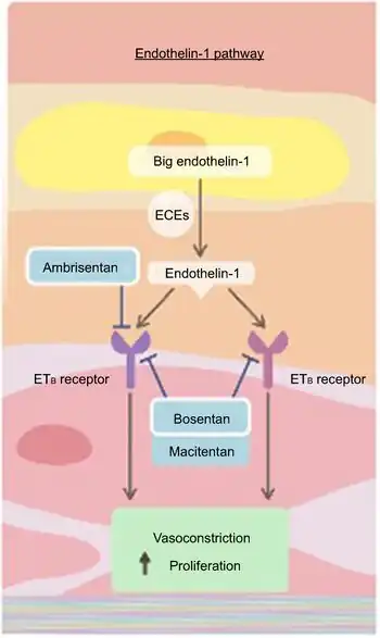 11. 11.0 11.1 Iglarz M, Binkert C, Morrison K, Fischli W, Gatfield J, Treiber A, et al. (December 2008). "Pharmacology of macitentan, an orally active tissue-targeting dual endothelin receptor antagonist". The Journal of Pharmacology and Experimental Therapeutics. 327 (3): 736–45. doi:10.1124/jpet.108.142976. PMID 18780830. S2CID 6315900.