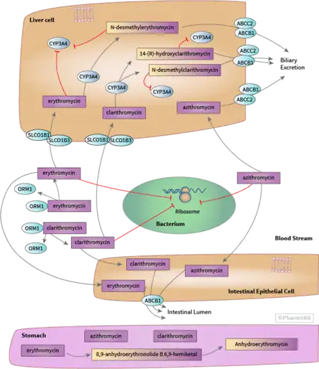 - ↑ Westphal JF (October 2000). "Macrolide - induced clinically relevant drug interactions with cytochrome P-450A (CYP) 3A4: an update focused on clarithromycin, azithromycin and dirithromycin". Br J Clin Pharmacol. 50 (4): 285–95. doi:10.1046/j.1365-2125.2000.00261.x. PMC 2015000. PMID 11012550.