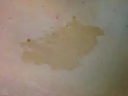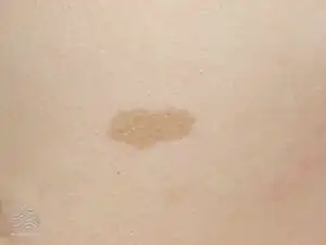 A macule is a small flat skin spot, that is neither raised or depressed.[1] The term is derived from the latin for stain and describes a color change.[2] It can be distinguished from a papule by being non-palpable.[3]