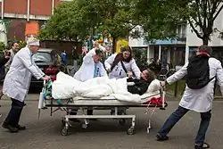 A Bed Push is a method of activism employed by multiple mental health agencies and advocates as a method of raising awareness about psychiatric care. Activists wheel a gurney through public spaces to provoke discussion about mental health care. MindFreedom has a recipe for a successful Bed Push on their website, urging participants to remain peaceful but also ensure they are seen, using attention-grabbing tactics such as blowing horns, mild traffic disruptions, and loud music.[11] Often patients in psychiatric care feel silenced and powerless, so the act of intentionally securing visibility and showing off resilience is one method of regaining dignity.[12]