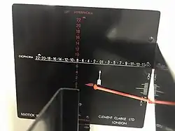 The Maddox Wing is an instrument utilized by ophthalmologists, orthoptists and optometrists in the measurement of strabismus (misalignment of the eyes; commonly referred to as a squint or lazy eye by the lay person). It is a quantitative and subjective method of measuring the size of a strabismic deviation by dissociation of the eyes brought about by two septa which are placed in such a way as to present fields to either eye separated by a diaphragm at the centre.[1] The right eye sees a red and white arrow, each of which point to a scale with numbers seen by the left eye; the red arrow points to the vertical red scale and the white arrow points to the horizontal white scale. A third arrow located to the right and below the horizontal white scale is used to measure torsion