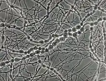 The growth of M. mycetomatis is very slow and can be broken down into three stages. Initially the colony is dome shaped white-yellow or olivaceous brown in color.[7] The mycelium is covered in grey down, giving it a woolly texture. Following the initial stage, brownish aerial mycelia (1 to 5 μm) form and the colony starts producing a diffusible pigment called pyomelanin, and becomes smooth in texture.[2] Older colonies form masses of hyphae called sclerotia or grains. In nutritionally deficient or potato-carrot media, black grains (0.75 to 1 mm in diameter) with undifferentiated polygonal cells can be observed.[6][7]