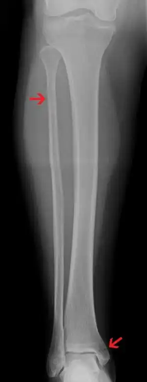 Ankle Xrays are used to detect widening of the tibiofibular syndesmosis or medial clear space. The medial clear space is the area between the talus of the ankle and the medial malleolus. Damage to the deltoid ligament and syndesmotic ligaments result in mortise instability, causing the talus to laterally shift and widen the medial clear space.[9][16] A study found that the medial clear space size of a normal ankle and an injured ankle measured at 4 millimetres and 5.4 millimetres in length respectively.[14] To confirm diagnosis, full-leg radiographs are used to inspect for fractures of the proximal fibula and widening of the interosseous clear space (or tibiofibular clear space). The interosseous clear space is the area between the medial side of the fibula and lateral side of the tibia. A peer-reviewed study, published in Injury in 2004, found that an interosseous clear space greater than 10 millimetres indicates diastasis of the syndesmotic ligaments.[9]