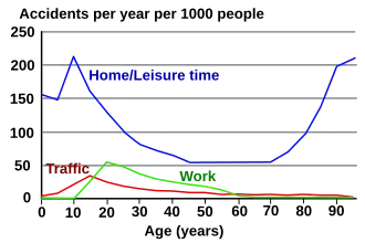 Due to anatomical and physiological differences, injuries in children need to be approached differently from those in adults.[92] Accidents are the leading cause of death in children between 1 and 14 years old.[76] In the United States, approximately sixteen million children go to an emergency department due to some form of injury every year,[76] with boys being more frequently injured than girls by a ratio of 2:1.[76] The world's five most common unintentional injuries in children as of 2008 are road crashes, drowning, burns, falls, and poisoning.[93]