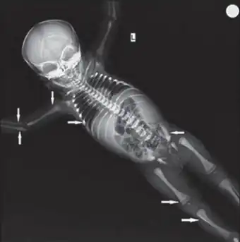 | Diagnosed as malignant infantile osteopetrosis, x-ray of skeleton shows (solid arrow) bone in bone appearance in femur, tibia, humerus, radius, ulna, iliac bones | |
