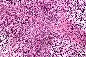 | Micrograph of malignant peripheral nerve sheath tumour with the typical herringbone pattern. H&E stain. | |