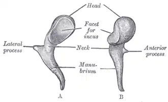 ![]() Left malleus. A. From behind. B. From within. | |