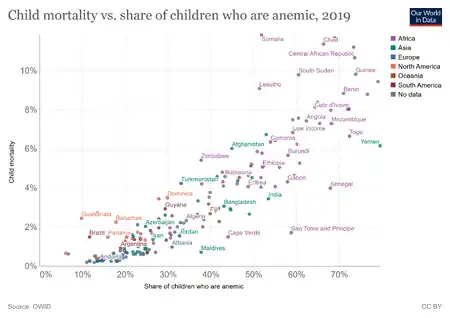 An IIT Delhi study found a link between anemia in children under the age of 5 and PM 2.5 levels in air, with every 10 μg per cubic meter increase in PM 2.5 levels being linked to a decrease in hemoglobin levels by 0.07 g/dL.[16] A study published in Nature Sustainability says that long term exposure to high PM 2.5 levels may be a cause of anemia among women, with their model showing a 7.23% increase in anemia among women of reproductive age for every 10 μg per cubic meter increase in PM 2.5 exposure. The same study posits that India fulfilling it's clean air targets would reduce the nationwide prevalence of anemia among women of reproductive age from 53% to 39.5%.[17]