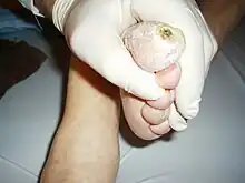 Malum perforans is a long-lasting, usually painless ulcer that penetrates deep into or through the skin, usually on the sole of the foot (in which case it may be called malum perforans pedis). It is often a complication in diabetes mellitus and other conditions affecting the nerves.[1]
