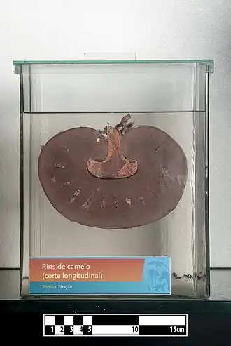 ![]() Unipapillary, multilobar, smooth, bean-shaped camel kidney, in which the renal papillae are completely fused into the renal crest.[1] | |