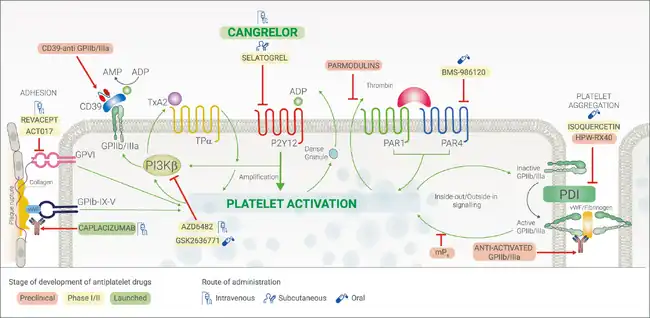 - ↑ De Luca, Leonardo; Steg, Philippe Gabriel; Bhatt, Deepak L.; Capodanno, Davide; Angiolillo, Dominick J. (6 July 2021). "Cangrelor: Clinical Data, Contemporary Use, and Future Perspectives". Journal of the American Heart Association. 10 (13): e022125. doi:10.1161/JAHA.121.022125.