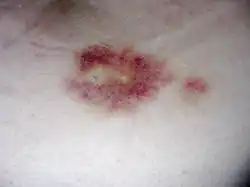 Both the interferons and glatiramer acetate are available only in injectable forms, and both can cause skin reactions at the injection site, specially with subcutaneous administration.[9][57][58] Skin reactions vary greatly in their clinical presentation and may include bruising, erythema, pain, pruritus, irritation, swelling and in the most extreme cases cutaneous necrosis.[57][58] They usually appear within the first month of treatment albeit their frequence and importance diminish after six months of use.[57] Mild skin reactions usually do not impede treatment whereas necroses appear in around 5% of patients and lead to the discontinuation of the therapy.[57] Also over time, a visible dent at the injection site due to the local destruction of fat tissue, known as lipoatrophy, may develop.[57]