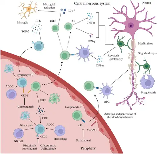 - ↑ Saidha S, Eckstein C, Calabresi PA (January 2012). "New and emerging disease modifying therapies for multiple sclerosis". Annals of the New York Academy of Sciences. 1247 (1): 117–37. Bibcode:2012NYASA1247..117S. doi:10.1111/j.1749-6632.2011.06272.x. PMID 22224673. S2CID 10837693.