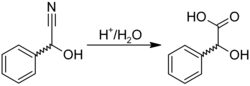 Mandelic acid is usually prepared by the acid-catalysed hydrolysis of mandelonitrile,[8] which is the cyanohydrin of benzaldehyde and can be synthesized in various ways:[9]