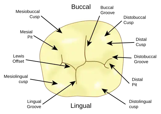 The mandibular first molar has five cusps: the mesiobuccal (MB, toward midline and cheek), mesiolingual (ML, toward midline and tongue), distolingual (DL, away from midline and towards tongue), distobuccal (DB, away from midline and toward cheek), and distal (D, away from midline), listed in order of decreasing size. Listed in order of decreasing height they are: ML, DL, DB, MB, and D. An eighth cusp was found in a primary second lower molar in an Argentinean child. Viewed from the top of the tooth (occlusal view), the mandibular first molar is pentagonal (five sided) in shape and tapers toward the lingual, with the sides being the buccal surface, the mesial surface, the lingual surface, distal surface, and the distobuccal surface. The occlusal surface has four grooves. The central groove is not straight but runs down the center of the tooth mesially to distally and contains four pits (mesial, central, central, and distal). The distobuccal groove runs from the distal pit in the central groove distobuccally separating the distal and distobuccal cusps. The lingual groove runs from the more distal of the central pits in the central groove toward the lingual surface between the mesiolingual and distolingual cusps. The buccal groove runs from the more mesial of the central pits in the central groove toward the buccal surface between the mesiobuccal and distobuccal cusps ending in the buccal pit. The portion of the central groove between the central pits is termed the Lewis offset and is mandatory to account for the locations of the buccal and lingual grooves (buccal groove being more mesial than the lingual groove while they are parallel). From the buccal (buccal view), two roots are present. The distal root is generally straighter, although both often have a slight distal curvature. The heights of contour on the mesial and distal contact the adjacent teeth and are located at the junction of the occlusal and middle thirds of the crown. The mesial view shows a slight tipping of the crown to the lingual. Both roots have flutings but they are more prominent on the mesial root. The mesial root is broader buccolingually and its apex is more blunted. The height of contour on the buccal is in the gingival third and the occlusal two thirds of the surface is flat. The lingual height of contour is in the middle third of the tooth and the lingual surface is evenly convex. The sharpness of the mesiolingual cusp can also be noted from this view.