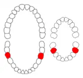 ![]() Mandibular first molars of permanent and primary teeth marked in red. | |