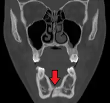Mandibular fractures are typically the result of trauma.[1] This can include a fall onto the chin or a hit from the side.[1] Rarely they may be due to osteonecrosis or tumors in the bone.[1] The most common area of fracture is at the condyle (36%), body (21%), angle (20%) and symphysis (14%).[1] While a diagnosis can occasionally be made with plain X-ray, modern CT scans are more accurate.[1]