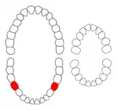 ![]() Mandibular second premolars of permanent teeth marked in red. There are no premolars in primary teeth. | |