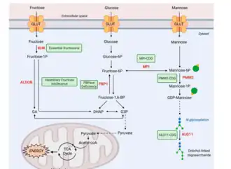 - ↑ Alton, G.; Hasilik, M.; Niehues, R.; Panneerselvam, K.; Etchison, J. R.; Fana, F.; Freeze, H. H. (1998). "Direct utilization of mannose for mammalian glycoprotein biosynthesis". Glycobiology. 8 (3): 285–295. doi:10.1093/glycob/8.3.285. PMID 9451038.