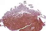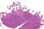 | Micrograph showing mantle cell lymphoma (bottom of image) in a biopsy of the terminal ileum. H&E stain. | |