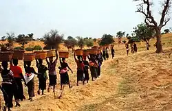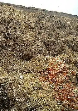 Most animal manure consists of feces. Common forms of animal manure include farmyard manure (or farm slurry (liquid manure).[1] Farmyard manure also contains plant material (often straw), which has been used as bedding for animals and has absorbed the feces and urine. Agricultural manure in liquid form, known as slurry, is produced by more intensive livestock rearing systems where concrete or slats are used instead of straw bedding. Manure from different animals has different qualities and requires different application rates when used as fertilizer. For example horses, cattle, pigs, sheep, chickens, turkeys, rabbits, and guano from seabirds and bats all have different properties.[2] For instance, sheep manure is high in nitrogen and potash, while pig manure is relatively low in both. Horses mainly eat grass and a few weeds, so horse manure can contain grass and weed seeds, because horses do not digest seeds as cattle do. Cattle manure is a good source of nitrogen as well as organic carbon.[3] Chicken litter, coming from a bird, is very concentrated in nitrogen and phosphate and is prized for both properties.[3][4]