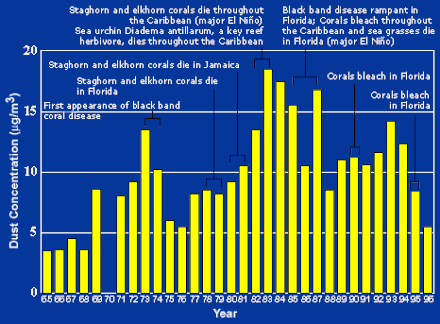 Since 1970, dust outbreaks have worsened due to periods of drought in Africa. There is a large variability in dust transport to the Caribbean and Florida from year to year;[28] however, the flux is greater during positive phases of the North Atlantic Oscillation.[29] The USGS links dust events to a decline in the health of coral reefs across the Caribbean and Florida, primarily since the 1970s.[30]