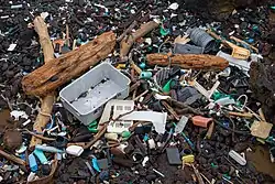 Marine debris, also known as marine litter, is human-created solid material that has deliberately or accidentally been released in seas or the ocean. Floating oceanic debris tends to accumulate at the center of gyres and on coastlines, frequently washing aground, when it is known as beach litter or tidewrack. Deliberate disposal of wastes at sea is called ocean dumping. Naturally occurring debris, such as driftwood and drift seeds, are also present. With the increasing use of plastic, human influence has become an issue as many types of (petrochemical) plastics do not biodegrade quickly, as would natural or organic materials.[40] The largest single type of plastic pollution (~10%) and majority of large plastic in the oceans is discarded and lost nets from the fishing industry.[41] Waterborne plastic poses a serious threat to fish, seabirds, marine reptiles, and marine mammals, as well as to boats and coasts.[42]