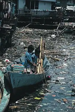 Marine pollution occurs when substances used or spread by humans, such as industrial, agricultural, and residential waste; particles; noise; excess carbon dioxide; or invasive organisms enter the ocean and cause harmful effects there. The majority of this waste (80%) comes from land-based activity, although marine transportation significantly contributes as well.[1] It is a combination of chemicals and trash, most of which comes from land sources and is washed or blown into the ocean. This pollution results in damage to the environment, to the health of all organisms, and to economic structures worldwide.[2] Since most inputs come from land, via rivers, sewage, or the atmosphere, it means that continental shelves are more vulnerable to pollution. Air pollution is also a contributing factor, as it carries iron, carbonic acid, nitrogen, silicon, sulfur, pesticides, and dust particles into the ocean.[3] The pollution often comes from nonpoint sources such as agricultural runoff, wind-blown debris, and dust. These nonpoint sources are largely due to runoff that enters the ocean through rivers, but wind-blown debris and dust can also play a role, as these pollutants can settle into waterways and oceans.[4] Pathways of pollution include direct discharge, land runoff, ship pollution, bilge pollution, dredging (which can create dredge plumes), atmospheric pollution and, potentially, deep sea mining.
