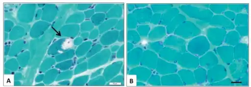 a)MSS individual with SIL1 mutation has rimmed vacuoles arrow b) no vacuole without SIL1 mutation