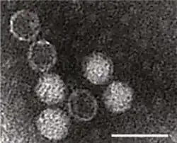 Electron micrograph of Heterosigma akashiwo RNA virus (HaRNAV) particles. Scale 50 nm.