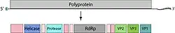 Marnaviridae genomes consist of linear, non-segmented, positive-sense single-stranded RNA 8.6-9.6 kb in length.[15] The genomic RNA generally contains either one or two open-reading frames (ORFs) that may overlap. For species whose genomes have two ORFs, ORF1 encodes proteins involved in replication (RNA helicase, RdRp) and a cysteine protease which cleaves the polyprotein, while ORF2 encodes structural proteins.[18] Genomes also contain internal ribosome entry sites (IRES) in intergenic regions and on the 5' end. The 3' end of the genome contains a poly(A) tail.[5]