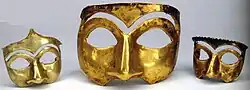 The word "mask" appeared in English in the 1530s, from Middle French masque "covering to hide or guard the face", derived in turn from Italian maschera, from Medieval Latin masca "mask, specter, nightmare".[1] This word is of uncertain origin, perhaps from Arabic maskharah مَسْخَرَۃٌ "buffoon", from the verb sakhira "to ridicule". However, it may also come from Provençal mascarar "to black (the face)" (or the related Catalan mascarar, Old French mascurer). This in turn is of uncertain origin – perhaps from a Germanic source akin to English "mesh", but perhaps from mask- "black", a borrowing from a pre-Indo-European language.[2] One German author claims the word "mask" is originally derived from the Spanish más que la cara (literally, "more than the face" or "added face"), which evolved to "máscara", while the Arabic "maskharat" – referring to the buffoonery which is possible only by disguising the face – would be based on these Spanish roots.[3] Other related forms are Hebrew masecha= "mask"; Arabic maskhara مَسْخَرَ = "he ridiculed, he mocked", masakha مَسَخَ = "he transfomed" (transitive).