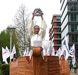 Copeau, in his attempts to "Naturalise" actors,[46] decided to use masks to liberate them from their "excessive awkwardness". In turn, Copeau's work with masks was taken on by his students including Etienne Decroux and later, via Jean Daste and Jacques Lecoq.[43] Lecoq, having worked as movement director at Teatro Piccalo in Italy, was influenced by the Commedia tradition. Lecoq met Amleto Satori, a sculptor, and they collaborated on reviving the techniques of making traditional leather Commedia masks. Later, developing Copeau's "noble mask", Lecoq would ask Satori to make him masques neutre (the neutral mask). For Lecoq, masks became an important training tool, the neutral mask being designed to facilitate a state of openness in the student-performers, moving gradually on to character and expressive masks, and finally to "the smallest mask in the world" the clown's red-nose. One highly important feature of Lecoq's use of mask, wasn't so much its visual impact on stage, but how it changed the performers movement on stage. It was a body-based approach to mask work, rather than a visually led one.[43][47] Lecoq's pedagogy has been hugely influential for theatre practitioners in Europe working with mask and has been exported widely across the world. This work with masks also relates to performing with portable structures and puppetry. Students of Lecoq have continued using masks in their work after leaving the school, such as in John Wright's Trestle Theatre.