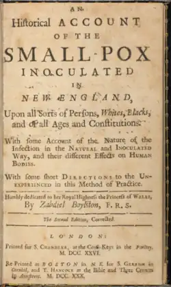 - ↑ Blake, John B. (1952). "The Inoculation Controversy in Boston: 1721-1722". The New England Quarterly. 25 (4): 489–506. doi:10.2307/362582. ISSN 0028-4866. JSTOR 362582.