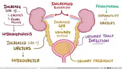 Progesterone causes many changes to the genitourinary system. A pregnant woman may experience an increase in the size of the kidneys and ureter due to the increase blood volume and vasculature. Later in pregnancy, the woman might develop physiological hydronephrosis and hydroureter, which are normal.[35] Progesterone causes vasodilatation and increased blood flow to the kidneys, and as a result glomerular filtration rate (GFR) commonly increases by 50%, returning to normal around 20 weeks postpartum.[24] The increased GFR increases the excretion of protein, albumin, and glucose. The increased GFR leads to increased urinary output, which the woman may experience as increased urinary frequency. Progesterone also causes decreased motility of the ureters, which can lead to stasis of the urine and hence an increased risk of urinary tract infection.[6]