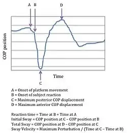 Under dynamic postural stability, which can be defined as the response to anterior (front) and posterior (back) translation perturbations, the effects of pregnancy are different. Initial sway, total sway, and sway velocity (see figure for description of variables) are significantly less during the third trimester than during the second trimester and when compared to non-pregnant women. These biomechanical characteristics are possible reasons why falls are more prevalent during the second trimester during pregnancy.