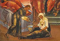 Finally, the midwife received the infant, placed it in pieces of cloth, cut the umbilical cord, and cleansed the baby.[35] The child was sprinkled with "fine and powdery salt, or natron or aphronitre" to soak up the birth residue, rinsed, and then powdered and rinsed again. Next, the midwives cleared away any and all mucus present from the nose, mouth, ears, or anus. Midwives were encouraged by Soranus to put olive oil in the baby's eyes to cleanse away any birth residue, and to place a piece of wool soaked in olive oil over the umbilical cord. After the delivery, the midwife made the initial call on whether or not an infant was healthy and fit to rear. She inspected the newborn for congenital deformities and testing its cry to hear whether or not it was robust and hearty. Ultimately, midwives made a determination about the chances for an infant's survival and likely recommended that a newborn with any severe deformities be exposed.[34]