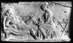 A 2nd-century terracotta relief from the Ostian tomb of Scribonia Attice, wife of physician-surgeon M. Ulpius Amerimnus, details a childbirth scene. Scribonia was a midwife and the relief shows her in the midst of a delivery. A patient sits in the birth chair, gripping the handles and the midwife's assistant stands behind her providing support. Scribonia sits on a low stool in front of the woman, modestly looking away while also assisting the delivery by dilating and massaging the vagina, as encouraged by Soranus.[35]
