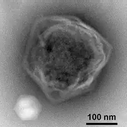 | The virophage Mavirus (lower left) with its associated giant virus CroV [1] | |